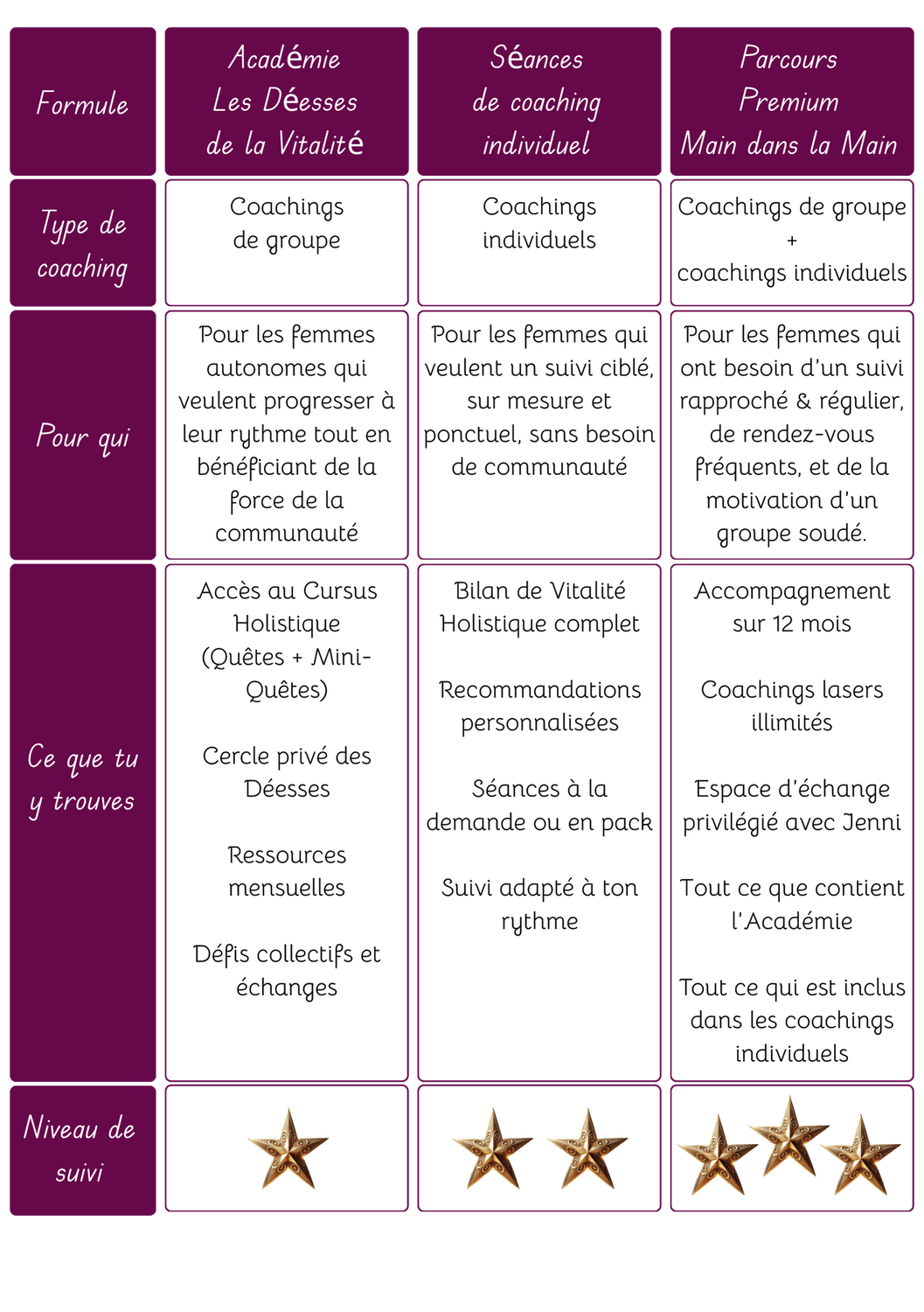 💡 L'accès à l'Académie Les Déesses de la Vitalité n'est pas compris dans cette formule, mais tu es libre d'y souscrire en parallèle si tu en as envie.